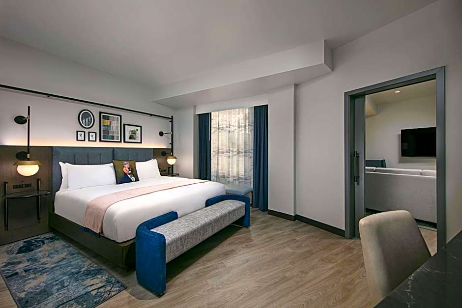 Relax in premium sized rooms overlooking the city via oversized windows. Designed in soothing hues, the room features one king bed with a pillow top mattress, a 65 in HDTV with webcasting, and a workstation with convenient electrical & charging outlets offering both wired and Wi-Fi connectivity. Refresh in the spacious bathroom with full-sized spa toiletries, blow dryer, robe & slippers, lighted makeup mirror, and purifying succulent plant. Other amenities include mini-fridge, Keurig coffee maker, in-room safe, iron & ironing board, and a handheld garment steamer. Mobility accessible features include widened doorways; lowered peephole; and bathroom with roll-in shower and grab bars.